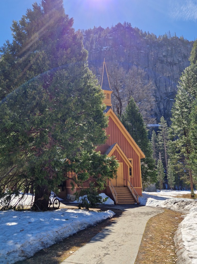 From Bridalveil Fall we made our way over towards El Capitan, and saw the famous Yosemite Chapel, the site of the Old Yosemite Village. It hasn’t always stood in its current location. It was built in 1879, near the foot of the Four Mile Trail, and moved in 1901. In December 1955 there was a major flooding event, and many of the buildings were damaged beyond repair. Most of the occupants moved to the new village, and a couple of the buildings were relocated to the Pioneer Yosemite History Center in Wawona.
