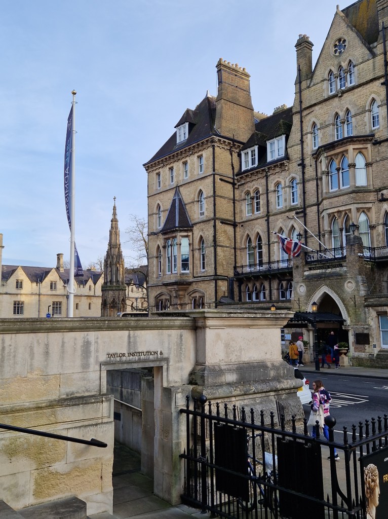 As the bus trundled along Woodstock Road, I pointed out things of note. St Edward’s School, educator of Sir Douglas Bader, Kenneth Grahame, Emilia Clarke and Florence Pugh, amongst many others, then the Horse and Jockey pub, now a private dwelling but I was pleased to see the former usage noted on the building, the Radcliffe Infirmary fountain, and as we entered St Giles’, The Eagle and Child. Currently undergoing renovation, this famous hostelry will be reopening as a pub, but no opening date has been announced at the time of writing. Here, ‘The Inklings’ used to meet, a literary society that counted the aforementioned C.S.Lewis and J.R.R.Tolkien among its members. The ‘Bird and Baby’ as they called it, was the scene, if rumour is to be believed, of many a heated discussion. Where St Giles’ meets Magdalen Street (pronounced ‘maudlin’) and Beaumont Street, you’ll see the Martyrs’ Memorial. This was erected in 1843 to commemorate two bishops and a former archbishop who were burned at the stake for heresy in the 1550’s. Their crime? Protestant beliefs. The memorial is made up of a spire and steps, and is often the site of protests. There was one in full swing when we first passed, but I wasn’t able to make out what the signs said, or the jumbled chants, but it was very peaceful and not threatening at all, and had dispersed the next time we passed.